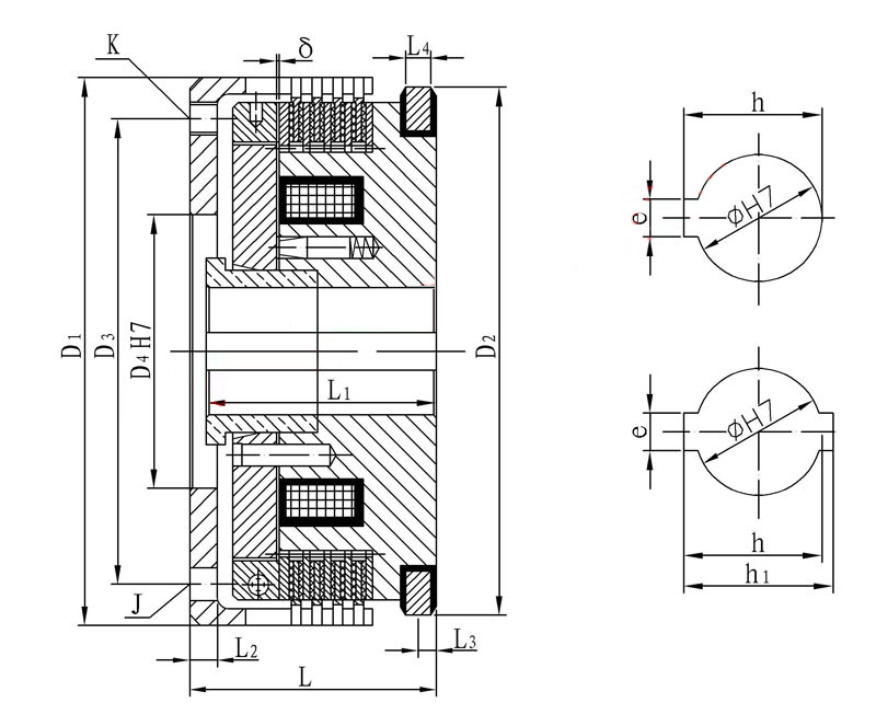 該系列離合器屬于磁通不經(jīng)過摩擦片組的結(jié)構(gòu)形式,短電后的殘余力矩小,動作時間快。特別適用于對動作時間有要求的場合使用。在使用過程中摩擦片磨損到一定程度,出現(xiàn)力矩下降時,需將工作氣隙進(jìn)行調(diào)整。